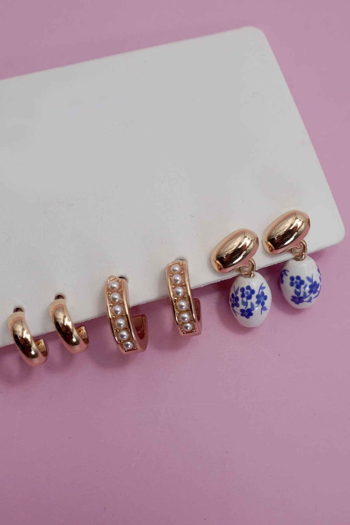 BLUE CERAMIC PORCELAIN TRIO HUGGIE HOOP EARRINGS 2
