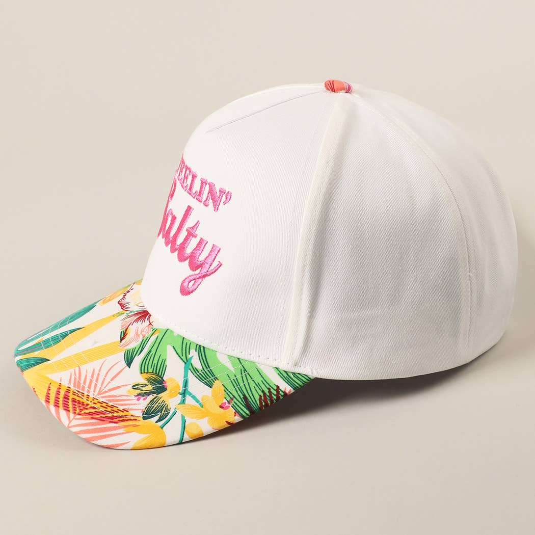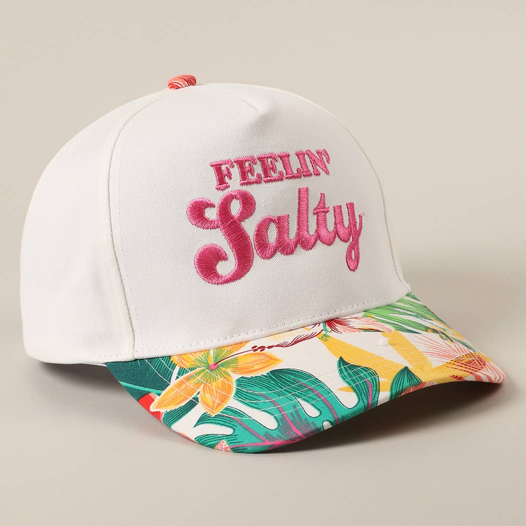 Feelin' Salty Letter Embroidery Floral Trucker Hat - Feelin' Salty Lettering Embroidered - 5 Panel Floral Design Two-Tone Trucker Hat - 100% Cotton - Relaxed Fit and Pre-Curved Visor **One Size Fits Most with Adjustable Snapback Closure ** The Feelin' Salty Letter Embroidery Floral Trucker Hat is a playful and trendy accessory that brings a touch of coastal vibes to any outfit. Featuring bold "Feelin' Salty" lettering embroidered on the front, this hat showcases a vibrant floral print on the mesh panels, adding a burst of color and style. The classic trucker design ensures breathability and comfort, while the adjustable snapback closure provides a personalized fit. Ideal for beach days, outdoor adventures, or casual outings, this hat combines fun, function, and flair, making it the perfect addition to any wardrobe seeking a carefree, summery touch.