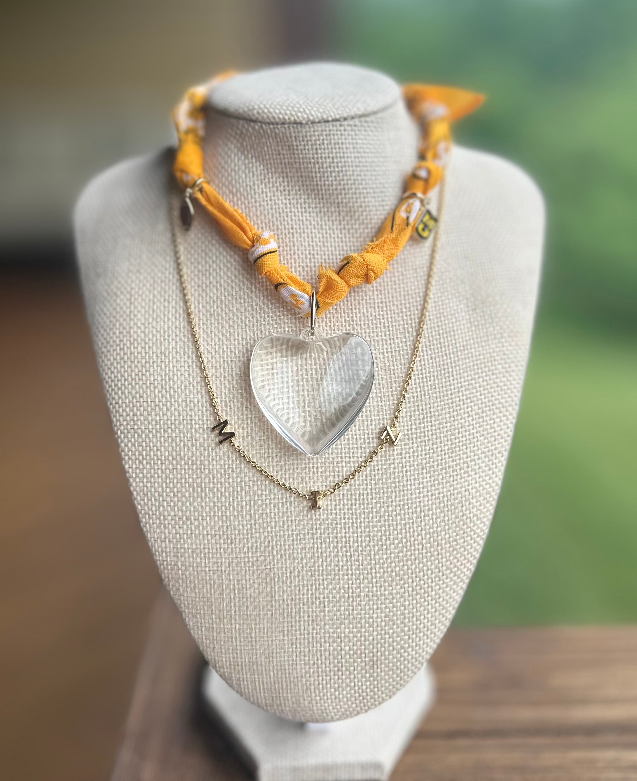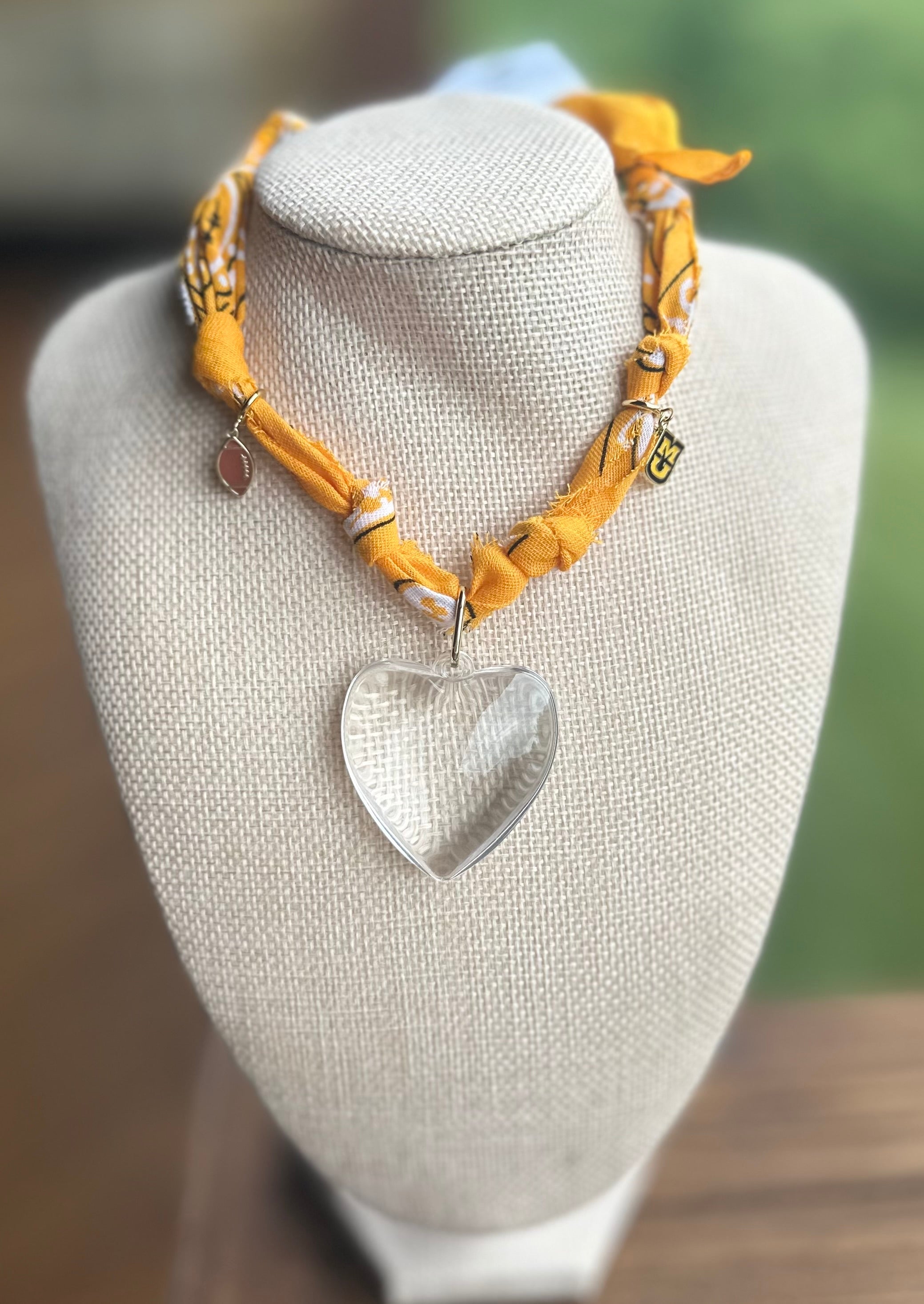 Add an eclectic accent to your look with this necklace, featuring bandana-inspired detailing and your choice of heart charm for a versatile, stackable statement. Included clippable charms for MU football will make the ultimate maximalist statement! *Note: Oversized Heart Charm is stationary, .
