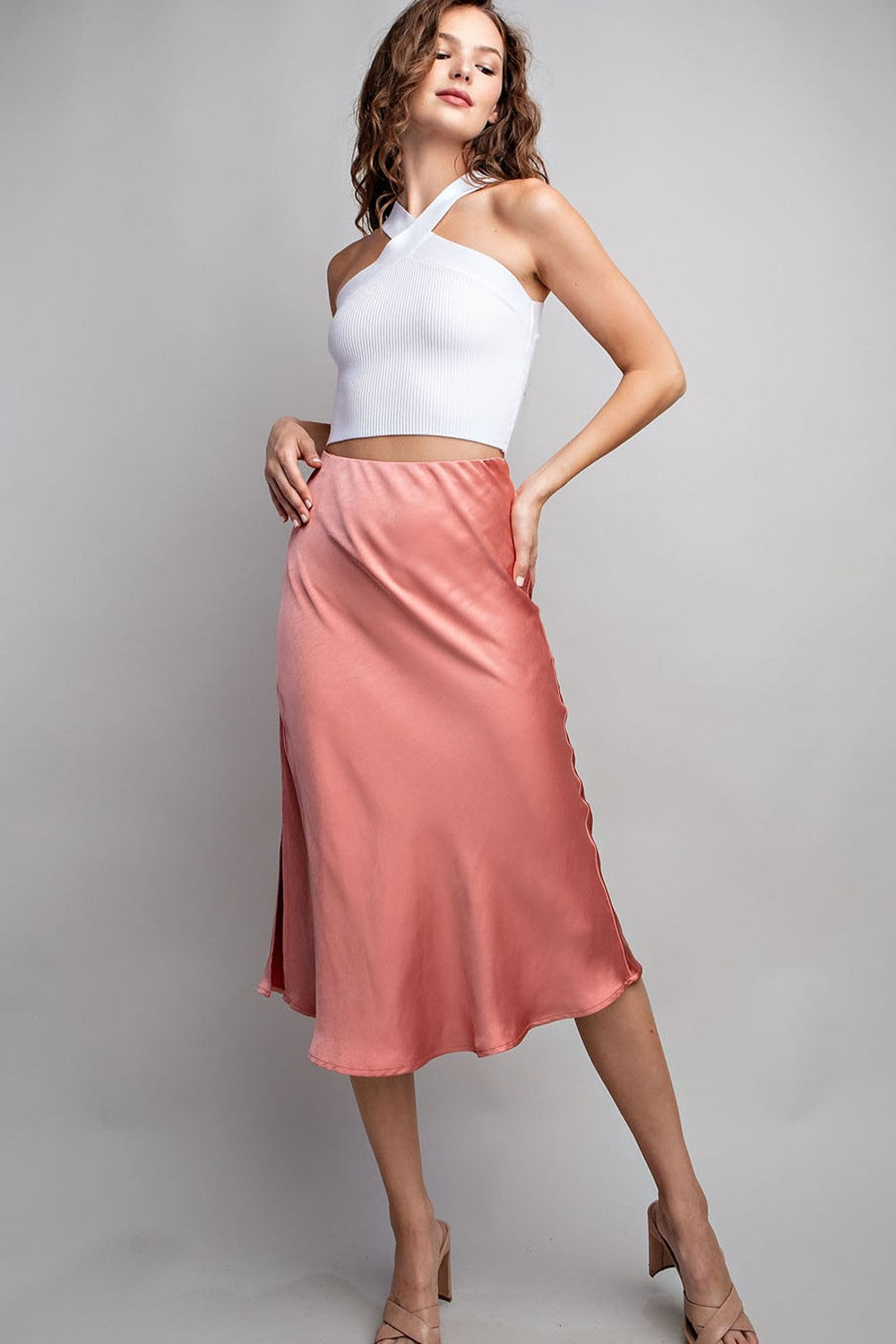 Classic satin midi dress in a beautiful rose gold color with a side slit.