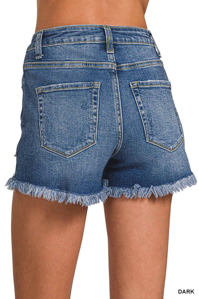 Introducing the Junie Denim Shorts - the perfect mix of edge and comfort. With a distressed hem, these dark wash shorts will add a touch of cool to any outfit. Made with stretch denim and a high rise, these shorts are as comfortable as they are stylish. (Get ready to be the coolest kid on the block!)