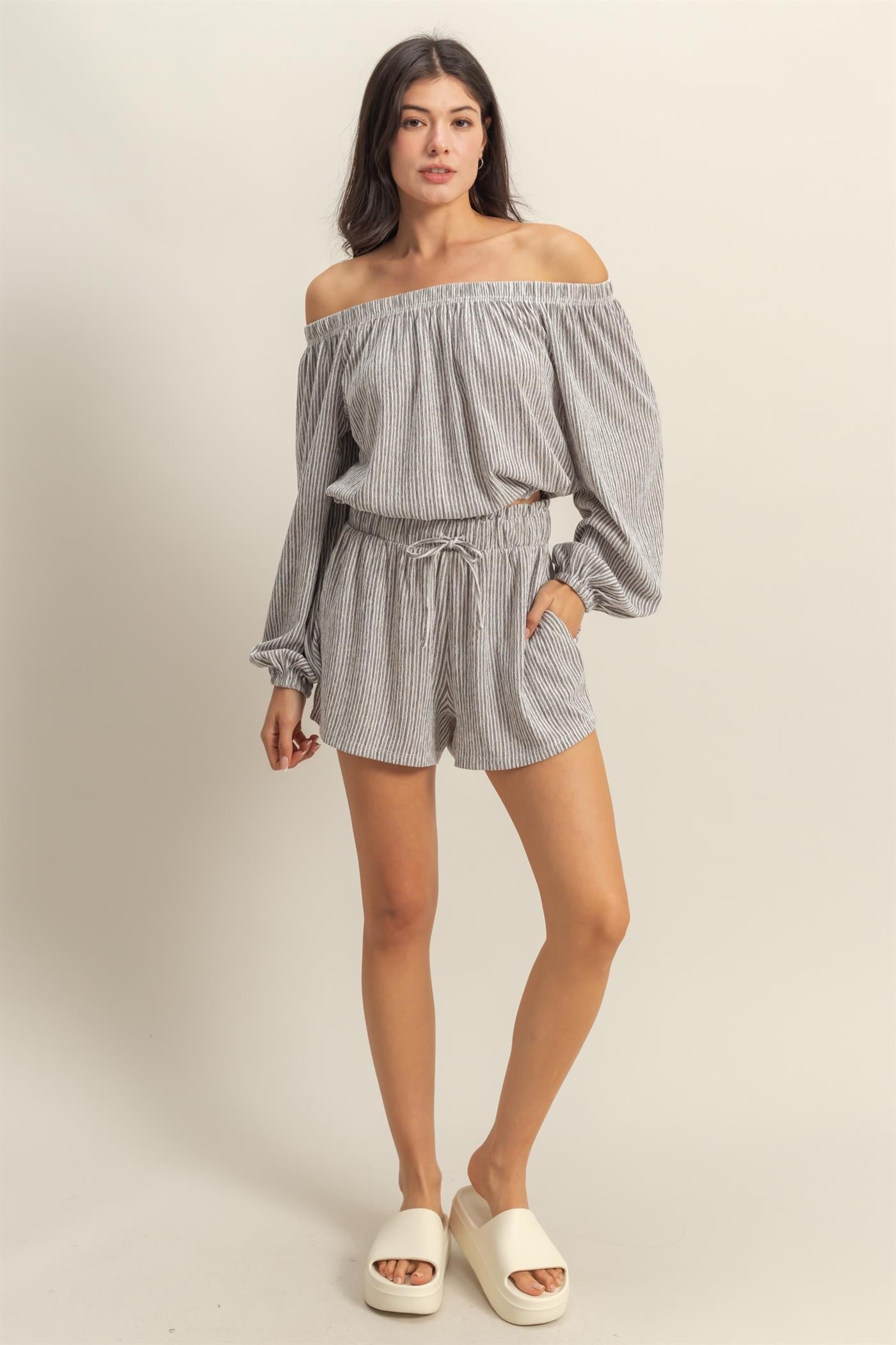 Stroll The Town Looking Your Best In This Matching Set. Covered In A Stripped Pattern, The Top Has An Off-The-Shoulder Neckline With Long Sleeves And A Relaxed Silhouette. The Matching Shorts Have A Drawstring Waist And A Loose Fit.