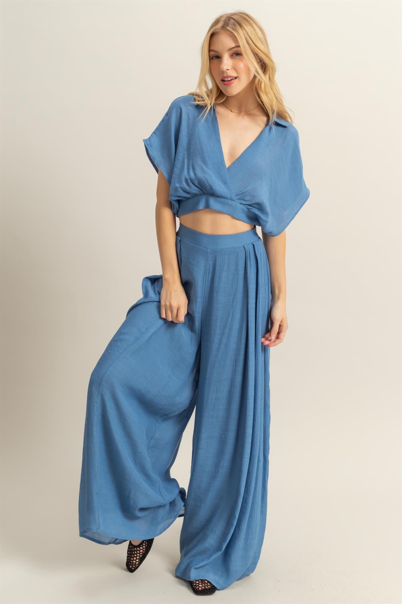 This Matching Set Is A Worthy Investment. The Top Comes With A Collared Neckline, Completed With A Cropped Hem. The Matching Pants Have Pleated Detailing And Offer An Extra Flowy Silhouette.
