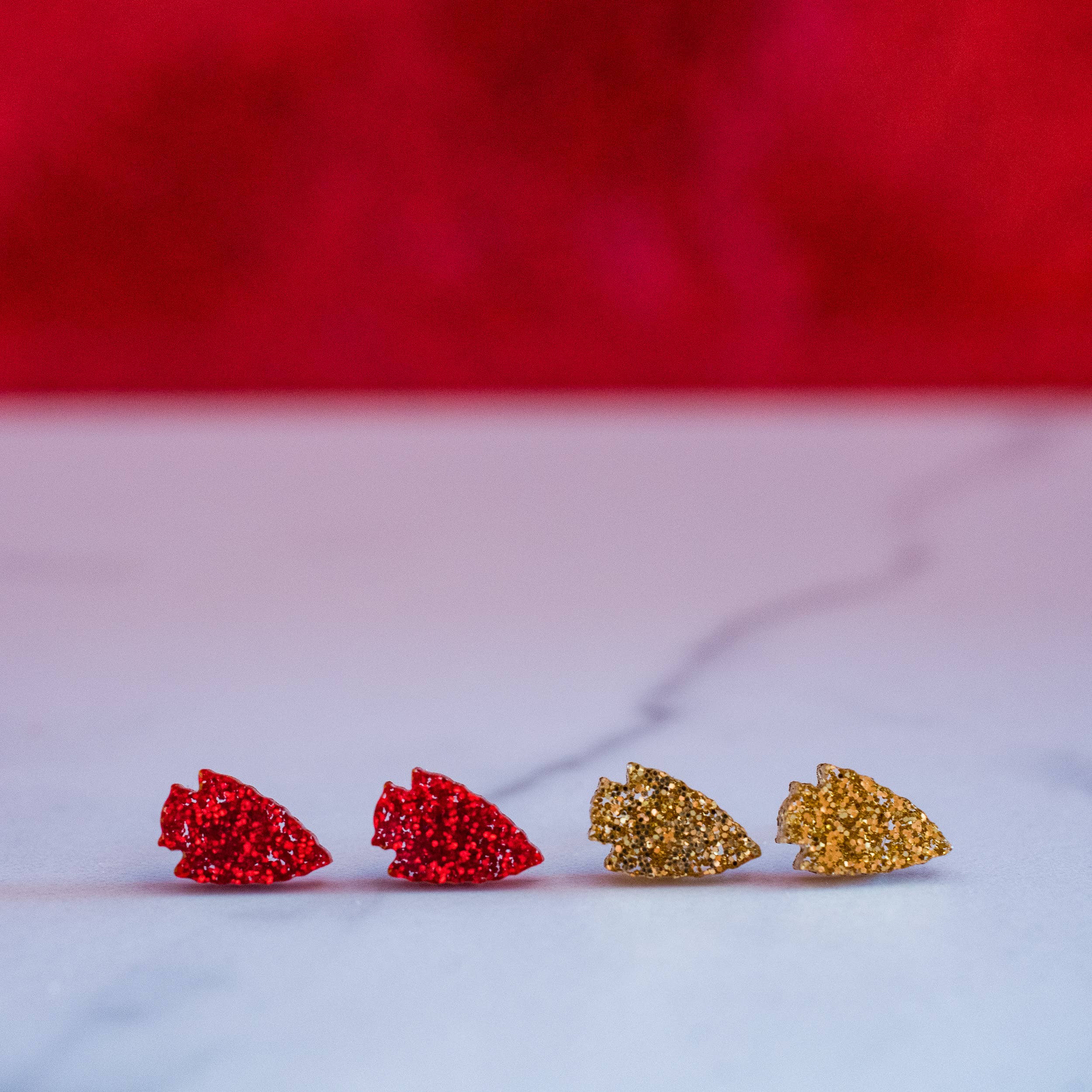 Red & gold glitter arrowhead studs. This is a 2 pack and contains 1 pair of red and 1 pair of gold as pictured. 10mm x 15mm. Great for sensitive ears! Material: Glitter acrylic Findings: Silver plated iron, Hypoallergenic, Nickel Free, Lead Free, Cadmium Free Dangle earrings come packaged on a card with silicone backs. Handcrafted in Kansas City, MO