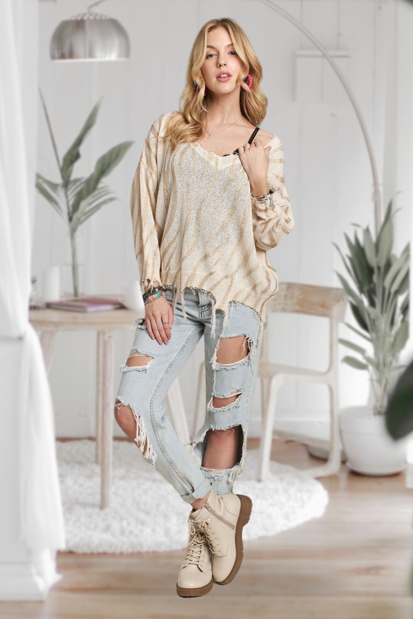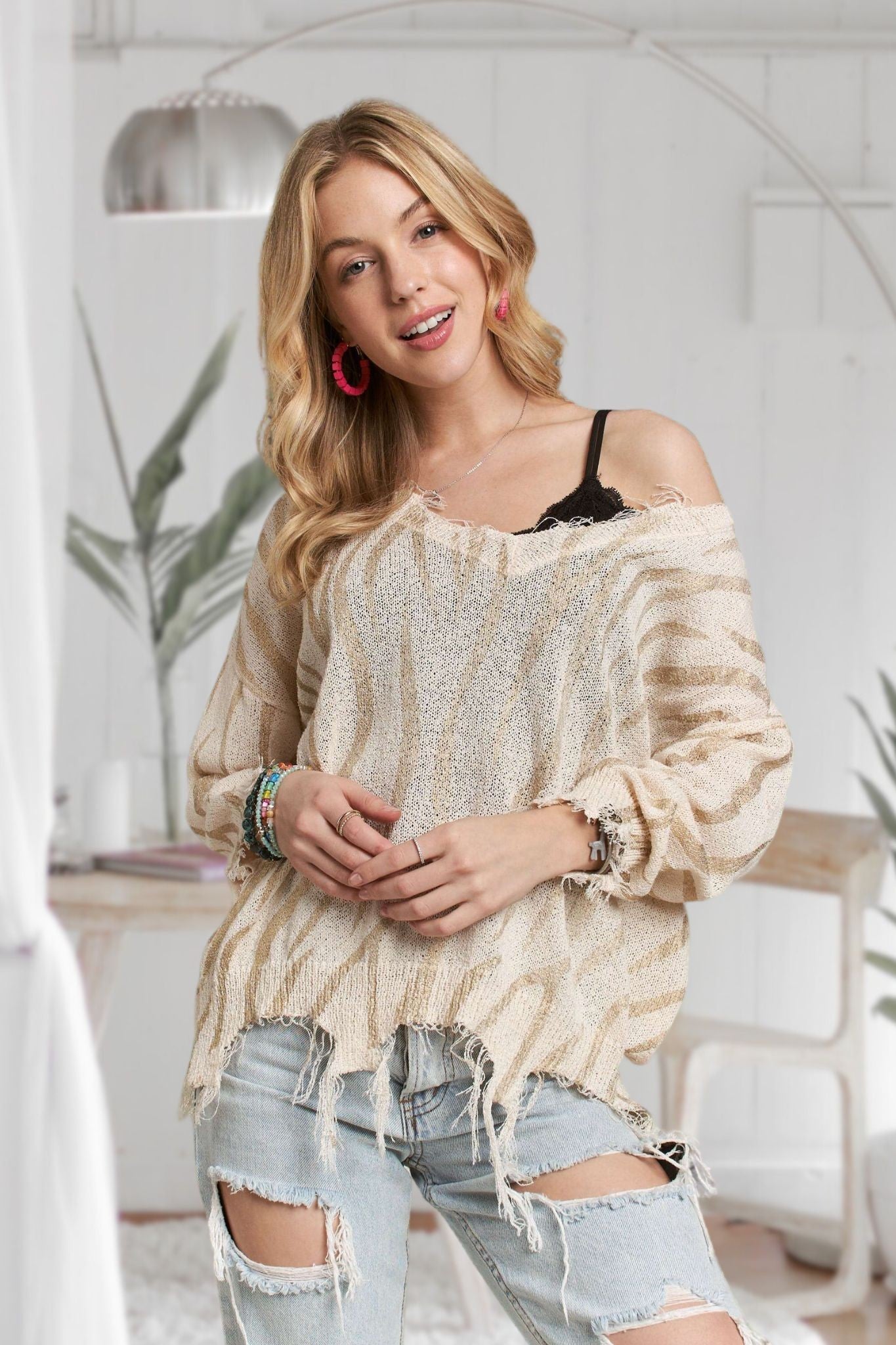 Add a touch of sparkle and sass to your wardrobe with this Metallic Stripe Sweater. Featuring a playful metallic Tiger print and cozy dolman sleeves, it’s perfect for effortless style. The wide V-neck and lightweight sweater knit make it comfy for any season, while the frayed edge detail adds a fun, lived-in vibe. Dress it up or down for a look that’s anything but ordinary.
