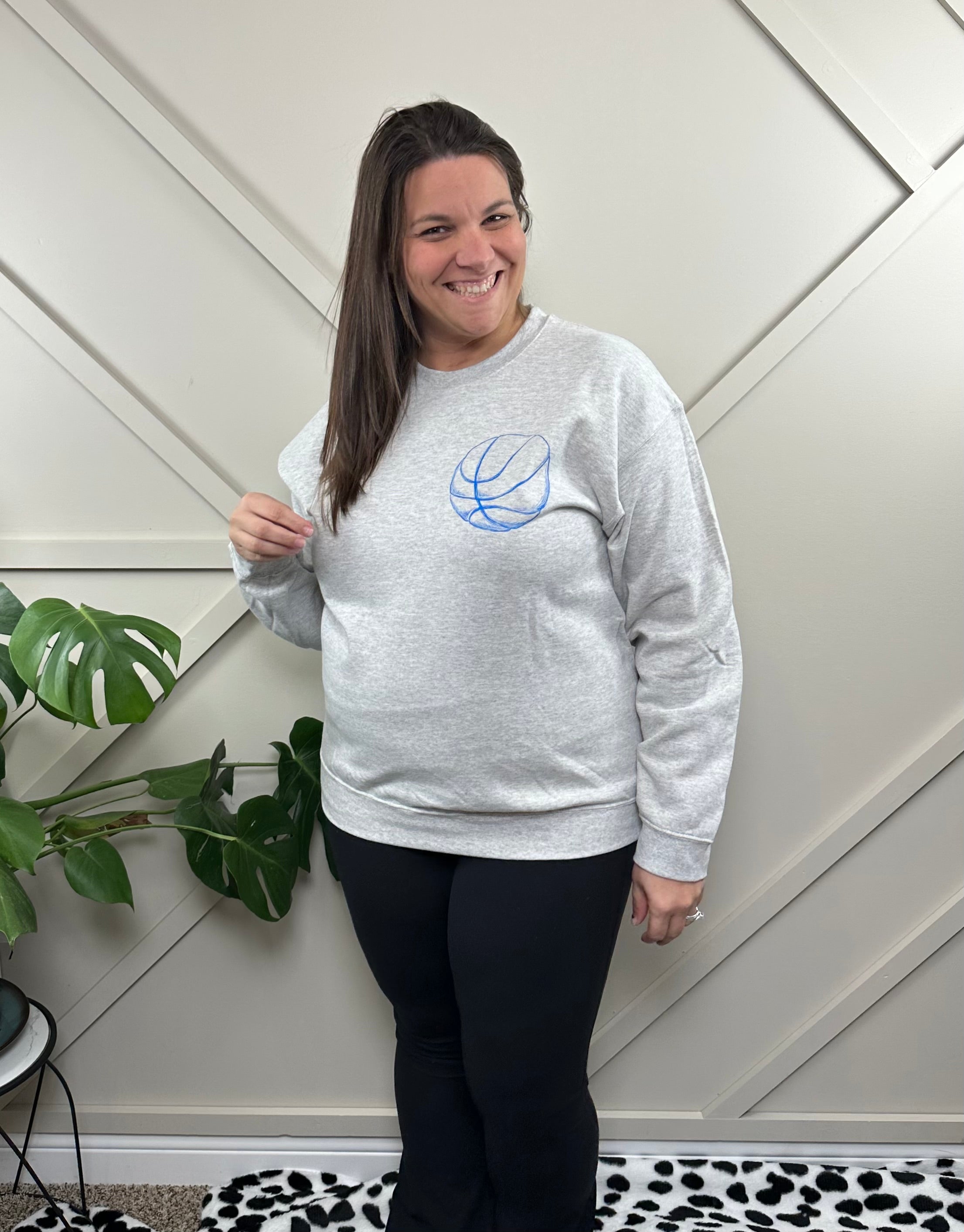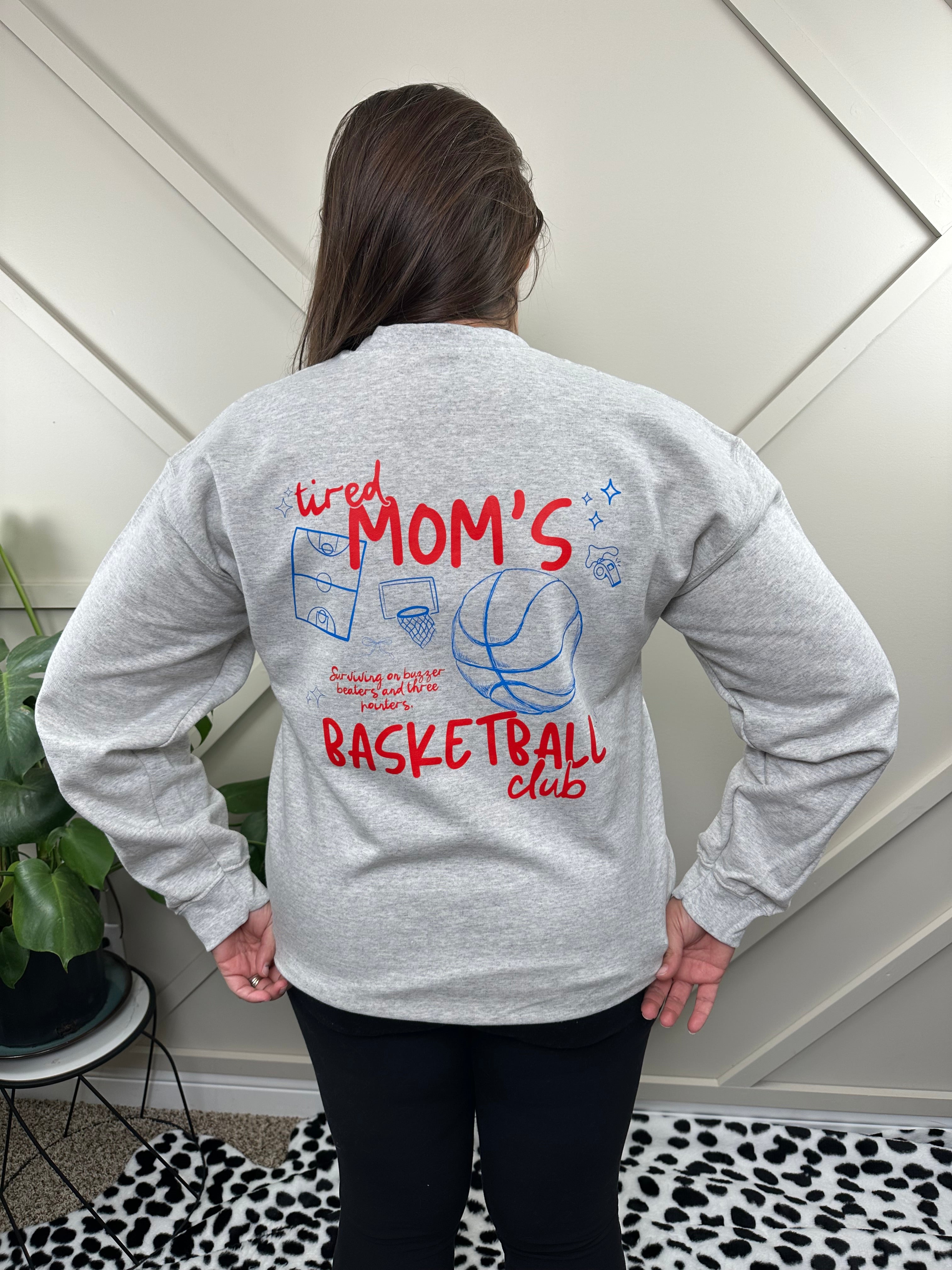 Surviving off buzzer beaters and 3 pointers. If you are a tired mom's basketball club member, you need this sweatshirt. Its printed on a unisex crewneck in a neutral ash grey color. Stick true to size or size up one or two for an oversized fit. Amber is wearing a large. They are pre shrunk so there won't be any surprises after washing.