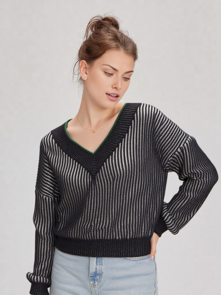 Cozy up in style with this playful 2 Toned Sweater featuring oversized vertical stripes that add a fun twist to your look. The relaxed drop shoulder and V-neck design keep it effortlessly chic, while long sleeves and a ribbed hem provide comfy warmth. Perfect for layering or wearing solo, this knit top brings a lively pop of color to any outfit.