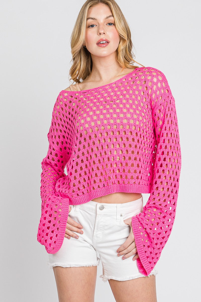 The crocheted look of the sweater is so trendy. The bell sleeves and cropped top make this a perfect spring transition piece or even a cute swim top cover-up for the summer. Pairs well with denim and a bralette underneath.