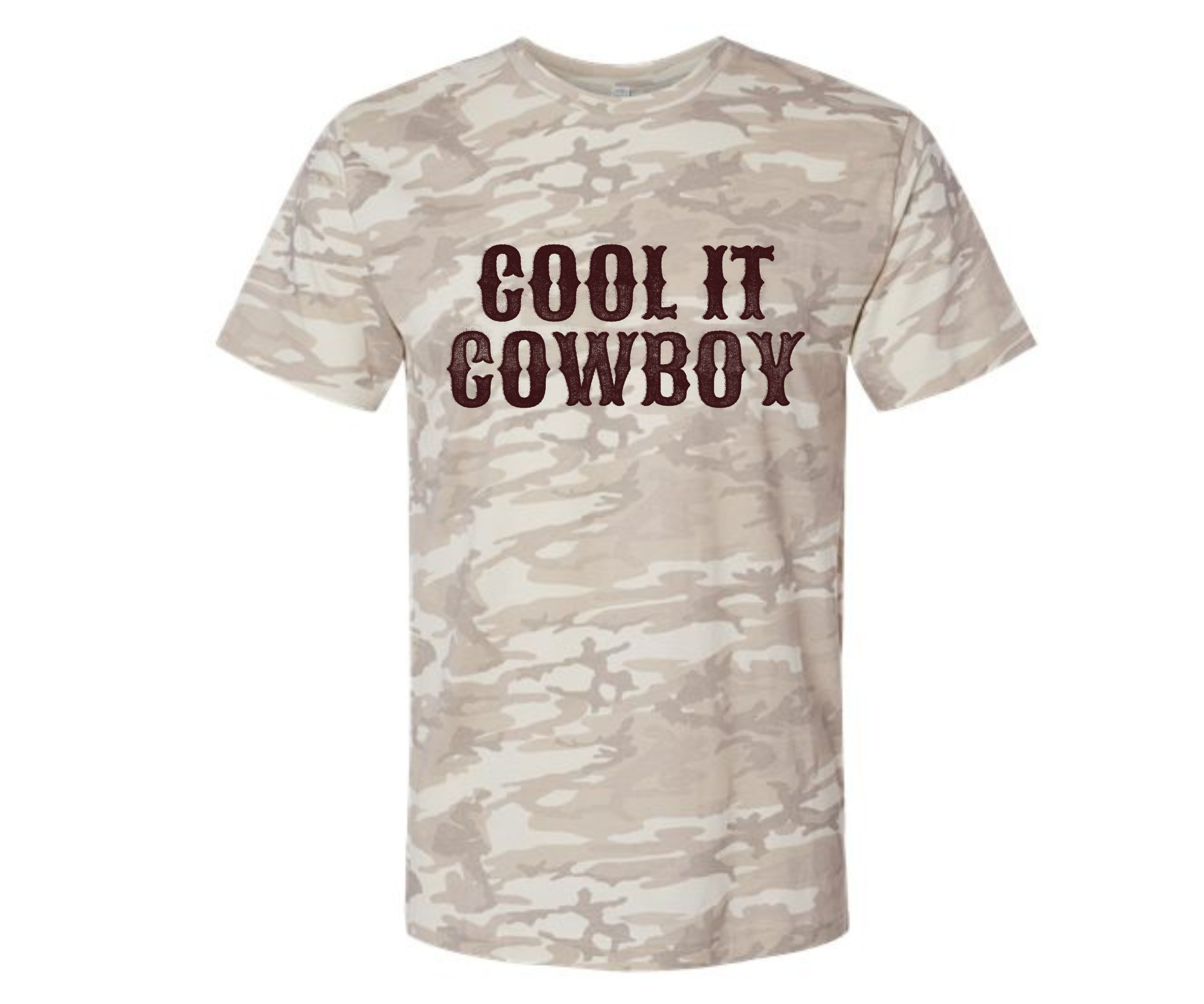 Cool it Cowboy tee printed on a muted camo tee. This tee is unisex but may shrink when washed. Perfect for rodeo nights or just small town adventures.