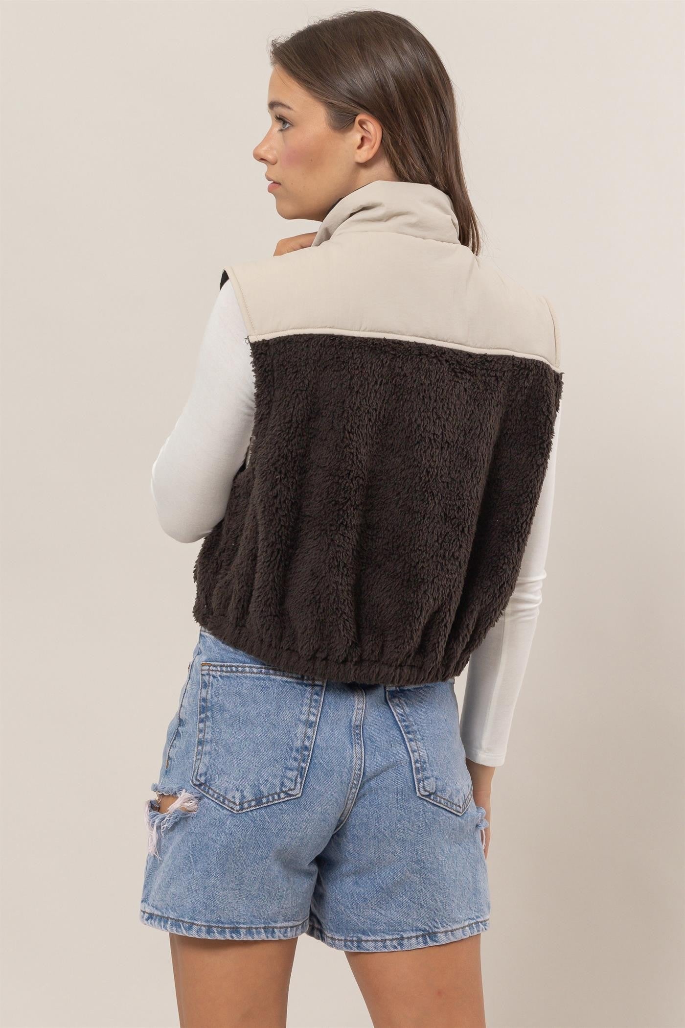 Looking Cute Is A One-Step Task With This Vest. It Features A Faux Shearling And Puffer Construction To Keep You Warm, Showcasing A Half-Zip Bodice With A High Neck And Zipper Pockets At The Front. A Cinched Hem Completes The Look.