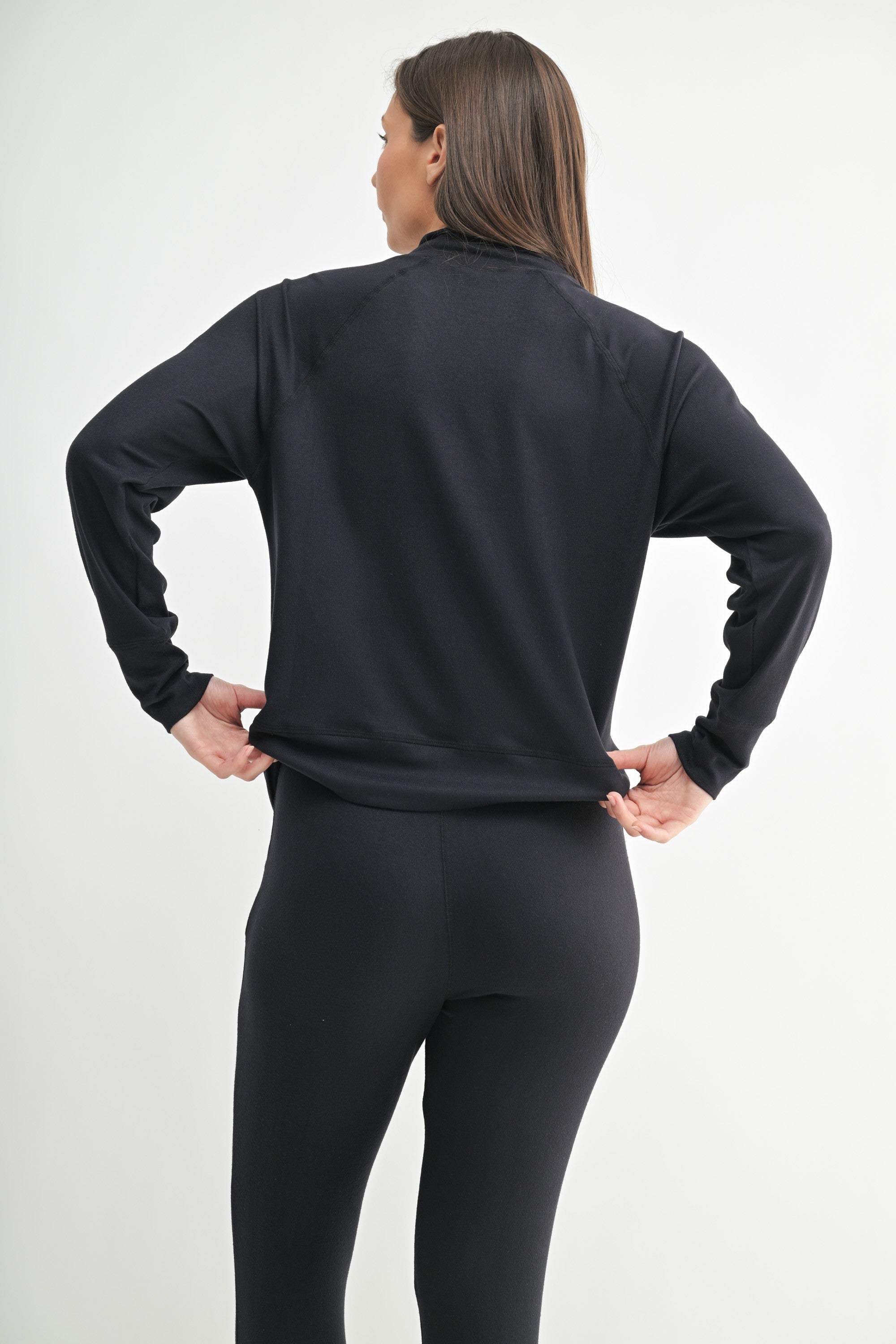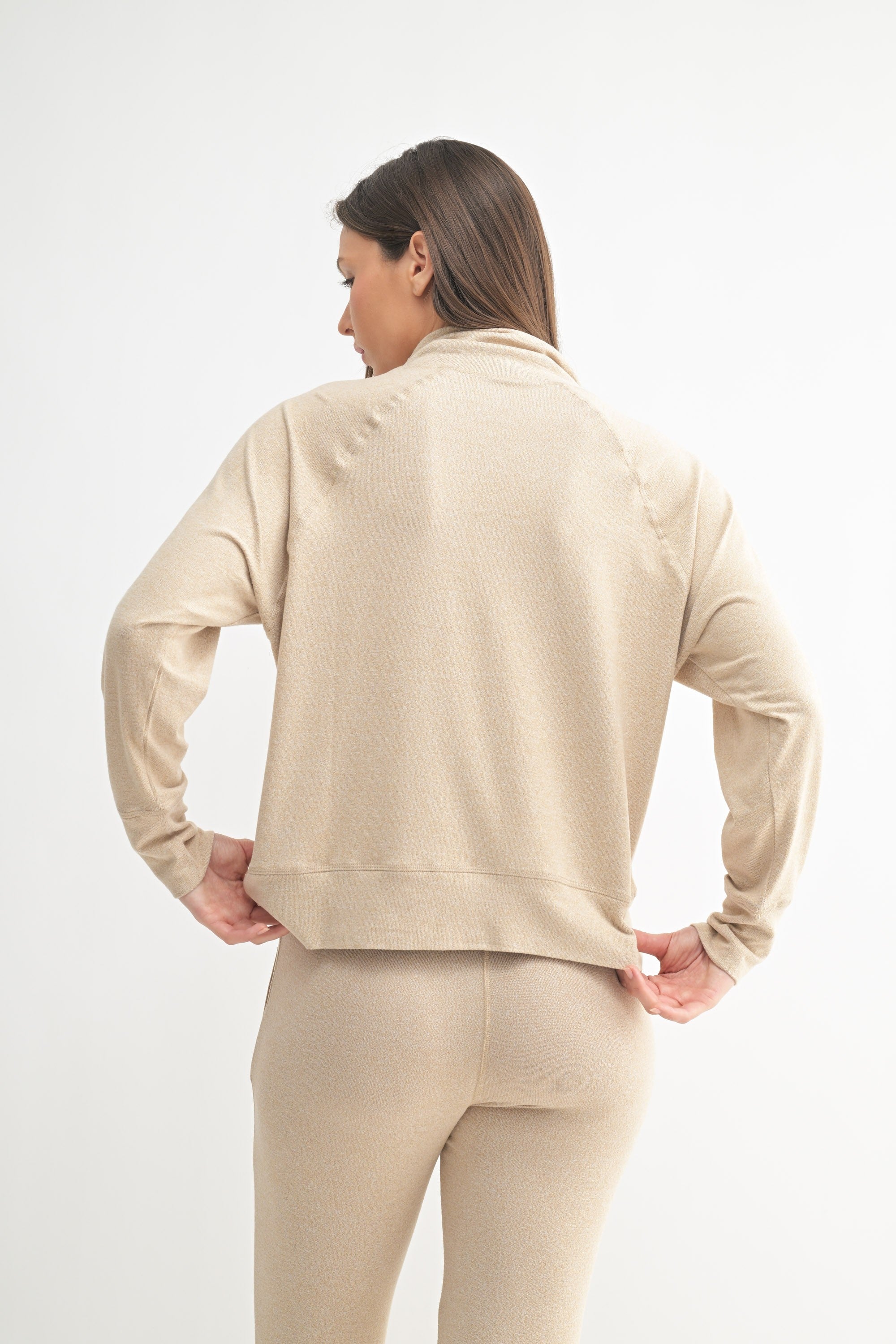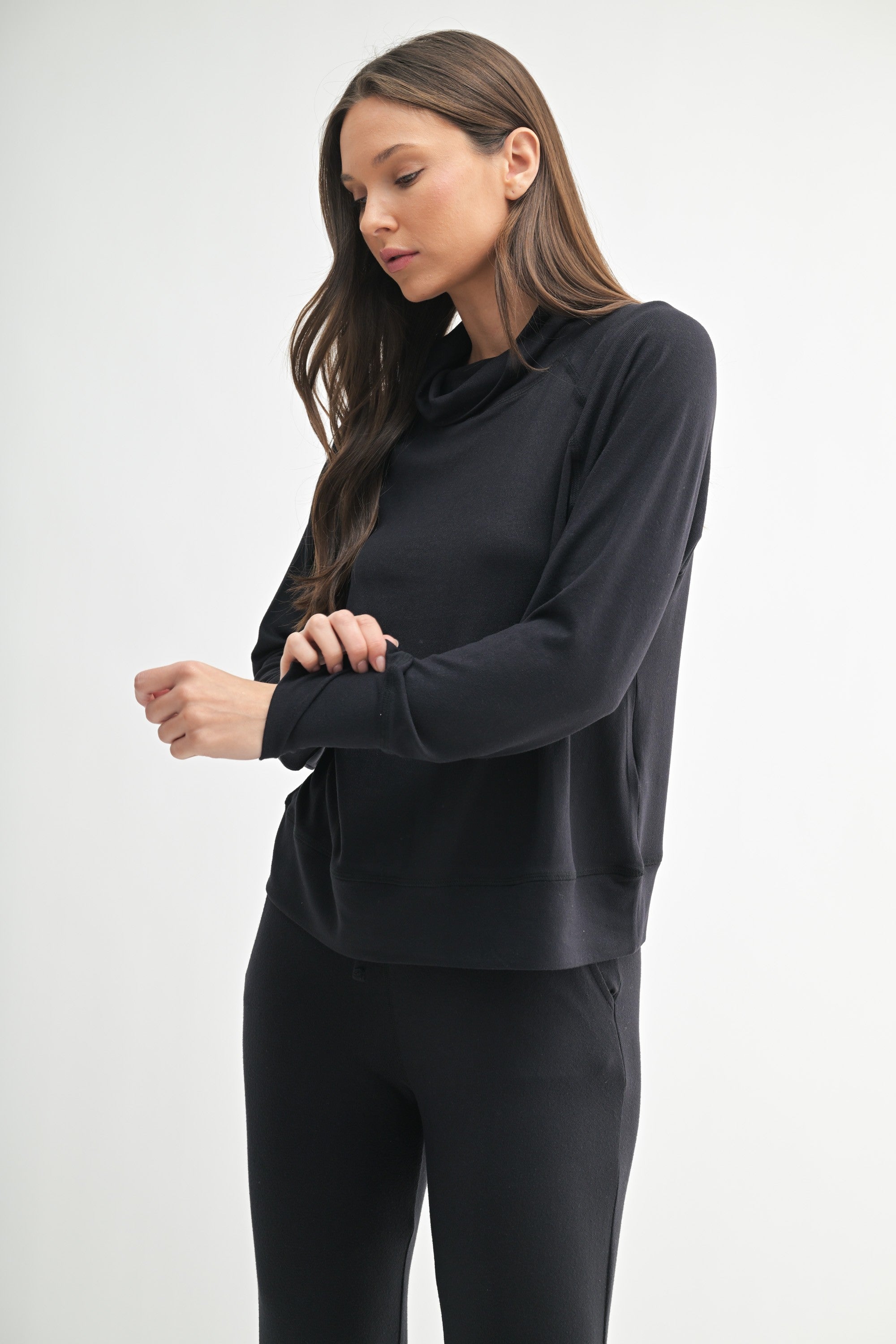 Top: Wrap yourself in cozy elegance. Crafted from luxurious brushed Hacci fabric, this long-sleeve top features a flattering cowl neckline and raglan sleeves for effortless style. The loose, wide-fit sleeves offer a relaxed silhouette, making it perfect for lounging or layering. Soft, breathable, and lightweight, this pullover will be your go-to for comfort without sacrificing chic appeal.