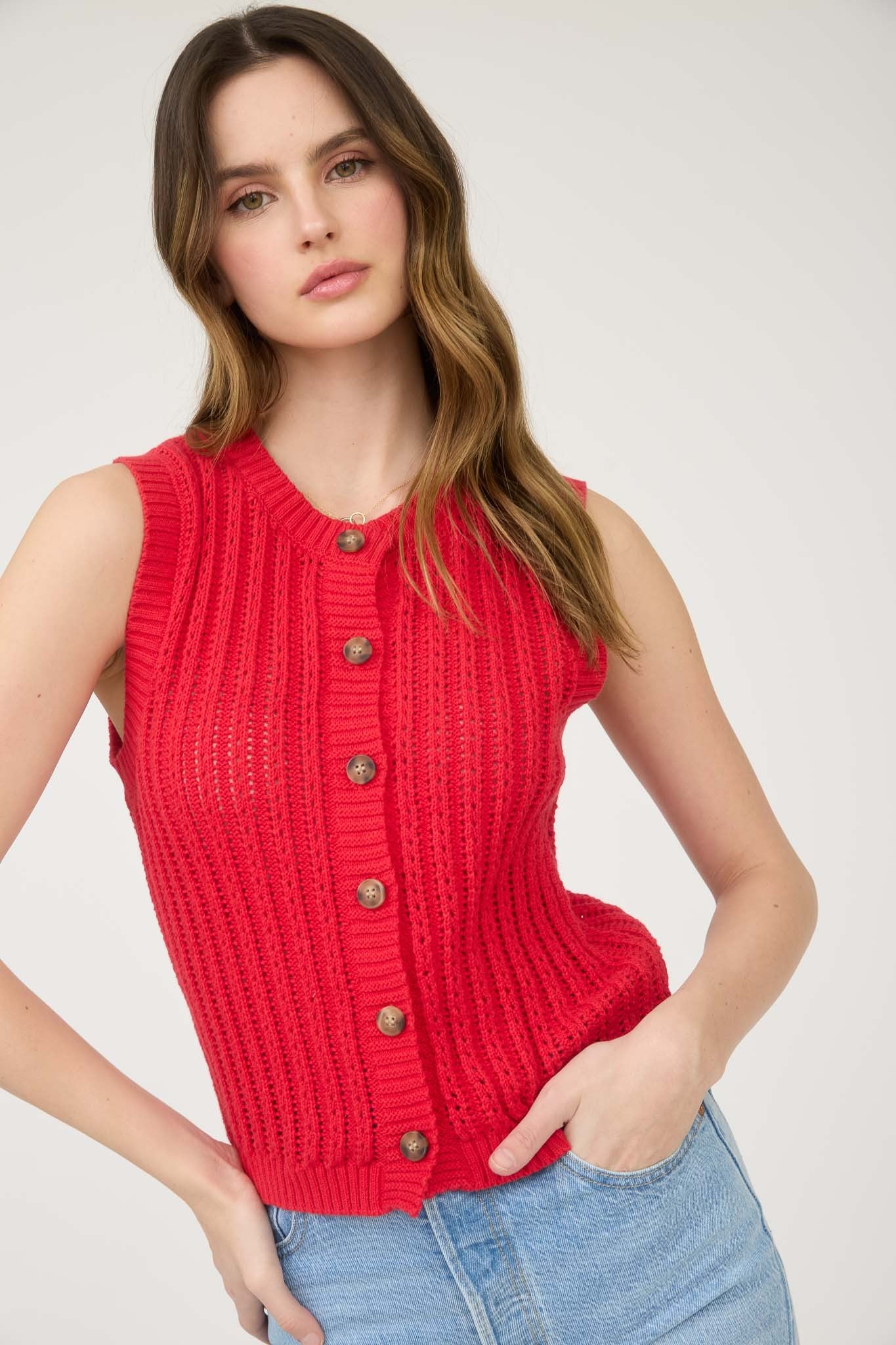 Add a fun twist to your wardrobe with the Scarlett Vest! This sleeveless cardigan vest features a cozy crochet sweater knit and playful ribbed trim. The button-down front and classic crew neckline make it easy to layer over your favorite tops, while the solid color keeps it versatile. Perfect for adding texture and charm to any outfit without the bulk of lining. Embrace effortless style with a touch of whimsy!